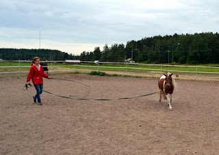 Heippa! Tiistaina iltapäivästä menin siis takaisin tallille kun tein tallilla työt ja Carita tuli mun kanssa sinne. Aluksi mie juoksutin Offen liinassa silleen aika rennosti vähän käyntiä ja ravia kumpaakin suuntaan. Poni oli melko nätisti vaikka muutaman kerran yritti pysähtyä "mitä jos ei nyt kuitenkaan tarvitsisi"..